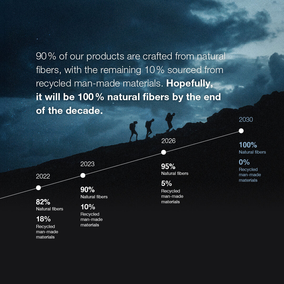 So, what can we do as a clothing company? The answer is a lot – and we’re doing it right now. In 2023, 90% of our products were crafted from natural fibers, with the remaining 10% sourced from recycled man-made materials. Hopefully, it will be 100% natural fibers by the end of the decade. Through innovative practices, we strive to fully eliminate the use of plastic in our production processes and packaging.
